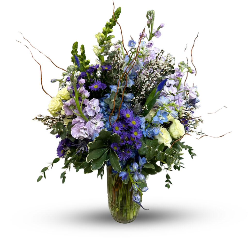 Make a wish! The night sky is rendered in gorgeous shades of blue, indigo, and purple in this beautiful arrangement, creating an absolutely breathtaking centerpiece.